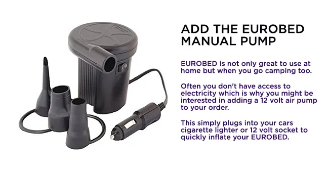 EUROBED is not only great to use at home but when you go camping too. Often you don't have access to electricity which is why you might be interested in adding a 12-volt air pump. This simply plugs into your car's cigarette lighter or to the 12-volt socket to quickly inflate your EUROBED.