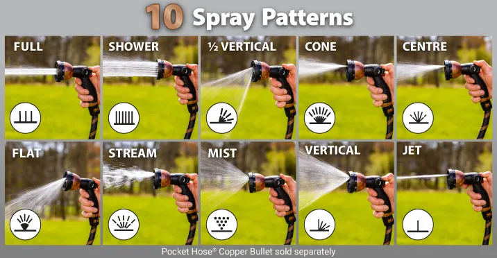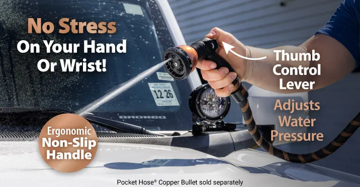 The Pocket Hose® Copper Bullet Deluxe 10-in-1 Sprayer features 10 precision spray patterns for any watering job. Ergonomically designed, it includes an easy thumb control lever for adjusting water pressure without squeezing a trigger, ensuring minimal stress on your wrist. Plus, it’s designed to prevent leaks and drips and attaches easily to any Pocket Hose® Copper Bullet.